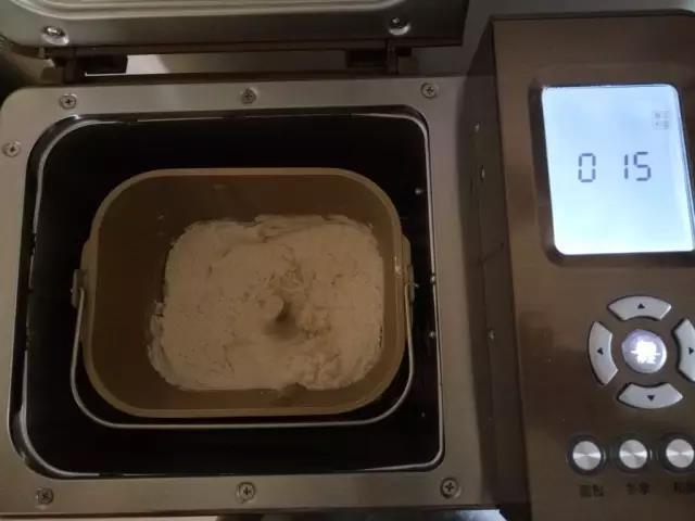 1. 把面包粉,细砂糖,鸡蛋,清水,盐和酵母先放入面包机,揉面一个程序,再加入软化的黄油,继续揉面一个程序至能拉出坚韧而不易破裂的薄膜