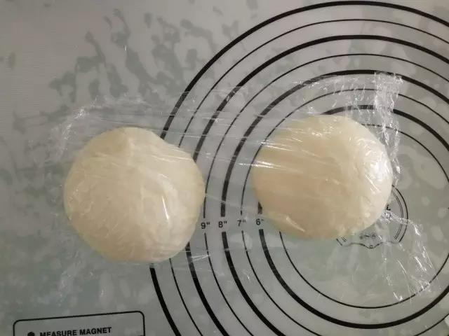 4. 发酵好的面团排气,均分成两个,揉圆,盖上保鲜膜,静置15分钟左右。