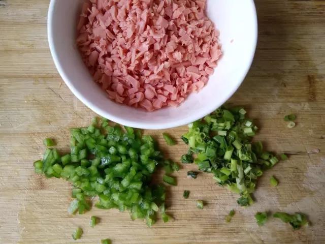 5. 香肠切小丁,葱切葱花,青椒切小丁。(其实我是因为葱花不够,才用的青椒,也可以全部用葱花)