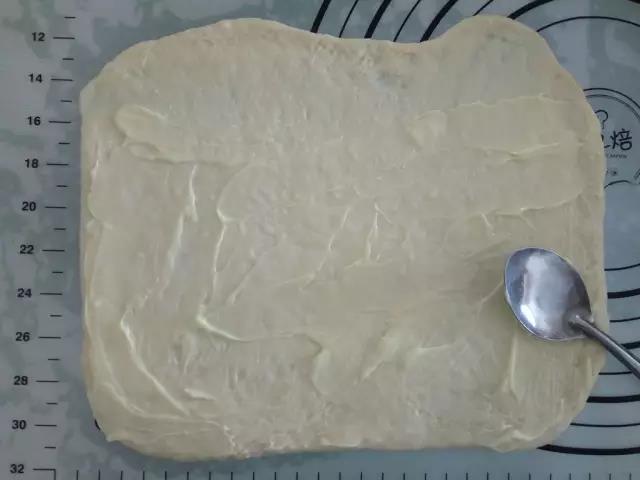 6. 取一个面团,擀开成长方形的薄片,抹上沙拉酱,注意末端不抹。