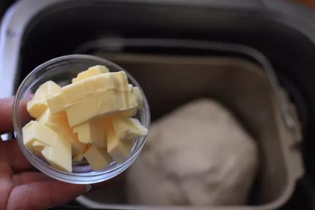 ② 搅拌至有一定筋性后,加入室温软化黄油。