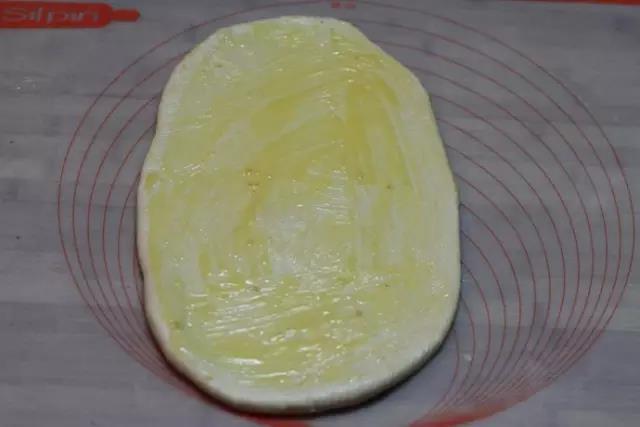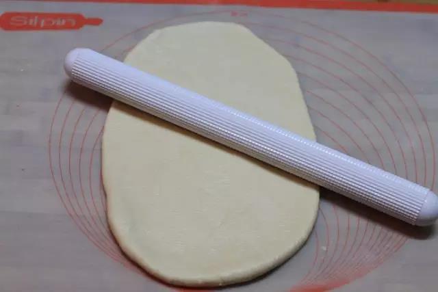 ⑥ 发好后的面团取出排气,尽可能擀成长方形(取出的动作不是用手直接去把面团扯出来而是用软刮板或者手指从面团的底部往上捞出来)。