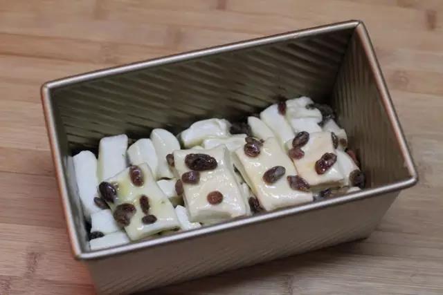 ⑬ 把这些小面片随意放入吐司模中(底部最好确保完全填满)。