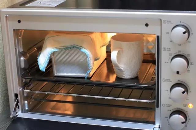 ⑭ 模具盖上湿布,烤盘中再放上一杯开水,启用松下烤箱发酵档30分钟,剩下利用余温发酵。