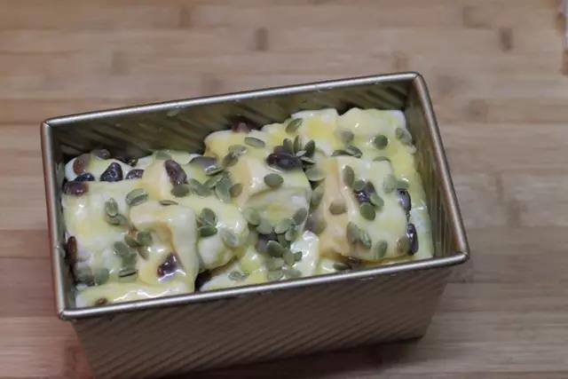 ⑯ 表面刷上剩下的炼乳酱,撒一些坚果(没杏仁片了,我就用了些南瓜籽,也很好吃)。